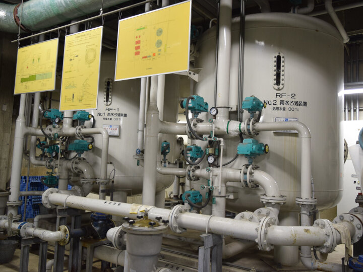 ドームの広大な屋根部(約33,000m2)とドライエリア部(約2,000m2)に降る雨水を、いったん地下にある「雨水貯留槽(2,800m3)」に貯めます。雑用水としての利用のほか、近隣の振動抑制や地域の浸水対策などを目的に、年間およそ43,000m3の雨水を貯留しています。