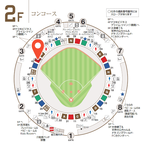赤い看板が目印のグッズ売店。レフト側にあるこの店舗では、ビジターチームのグッズも多く揃えています。